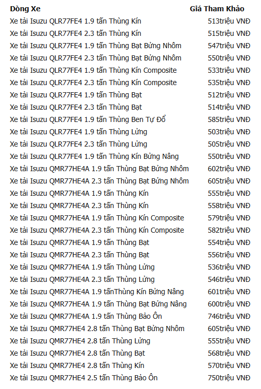 Điểm chung của những mẫu thiết kế này đều hướng đến không gian chứa lớn, đầu lái tiện nghi, dễ điều khiển, đảm bảo an toàn khi di chuyển. Dưới đây là bảng giá Isuzu xe tải mới nhất bạn có thể tham khảo: